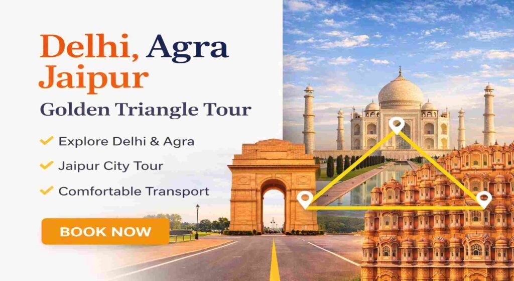 The delhi agra jaipur sightseeing tour by Garvit Cabs covers 650km in AC private vehicles looping through Delhi, Agra, and Jaipur. Golden triangle tour price begins at 14,700 for 3 nights and 4 days, and 19,500 for 4 nights luxury. Ideal from Oct to Mar with lady bazaars, Fatehpur Sikri, and UNESCO sites. Family and couple packages include English guides and heritage hotels. Golden triangle tour cost saves 20 percent over individual bookings.